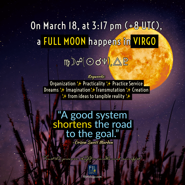 This FULL MOON shines a light on the areas of our life that need order and organization. Virgo excels in narrowed attention and focused thought, and this full Moon will feel like a magnifying glass is placed on the life area where this happens in your chart, so you can sharply see details that are often overlooked. This is a remarkable chance for check-ups and maintenance, to set things right and to make sure everything is where they are supposed to be.