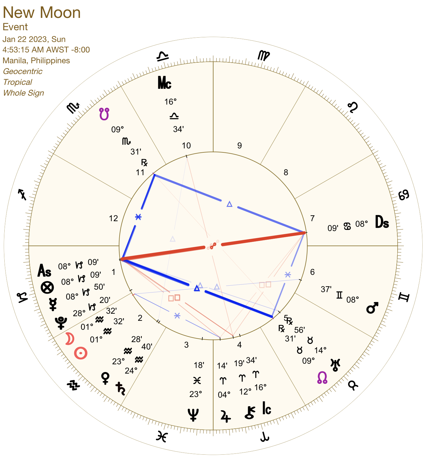 A NEW MOON happens on January 22, 2023 (6:16 PM, Philippine Time), at exactly 01°32′ of fixed air AQUARIUS, the sign of the water bearer.
