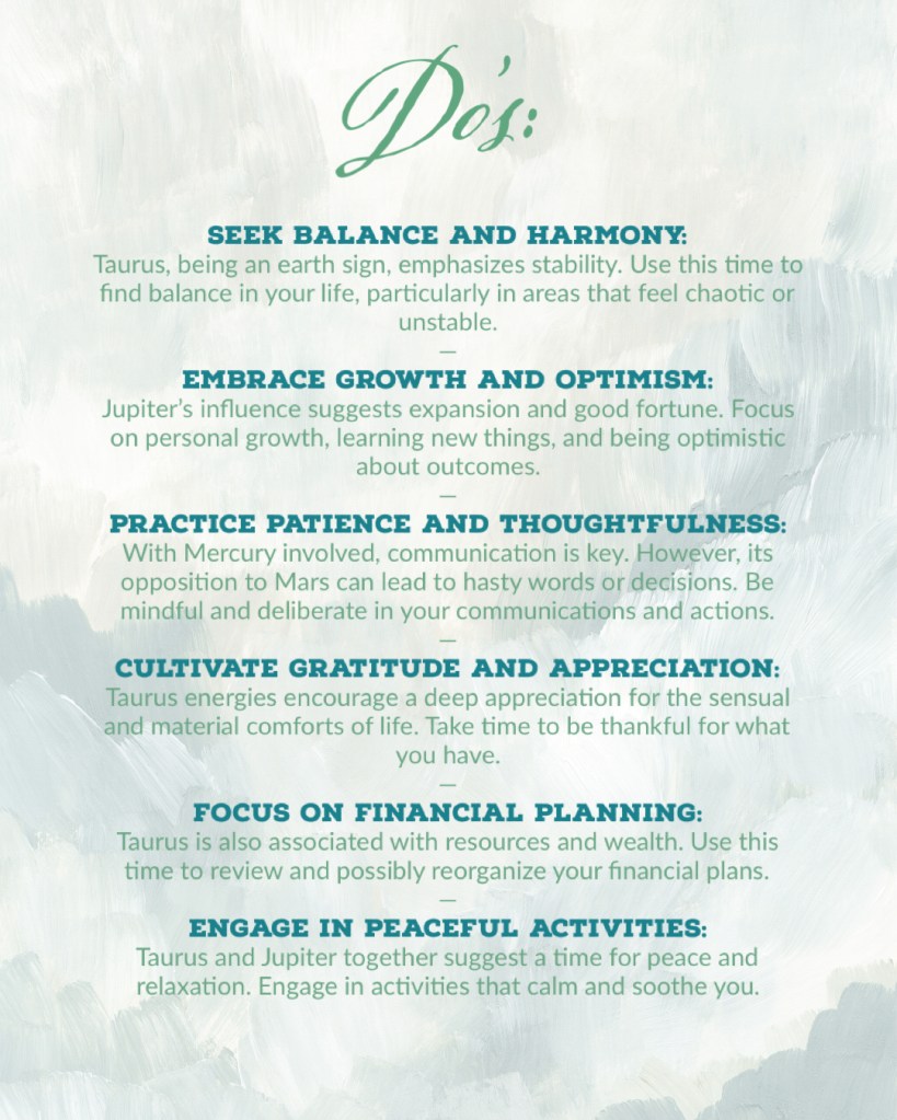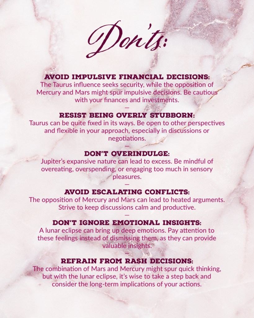 Jupiter’s presence brings an element of expansion and amplification. In Taurus, this could mean an expansion of material goals, a heightened desire for comfort, or an increased focus on personal values. Jupiter also brings a sense of optimism and possibility, suggesting that the outcomes of this eclipse could open new doors and offer broader perspectives that are now aligned with an updated version of who you are to become, after all this season’s dust has settled.