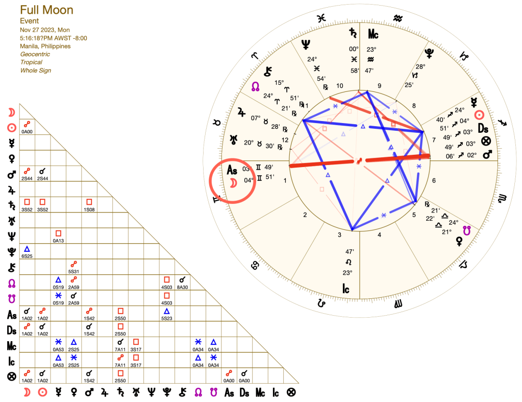 A FULL MOON happens on November 27, 2023 (5:16 PM, Philippine Time), at exactly 4°51 minutes in the realm of mutable air, GEMINI, the sign of the twins.