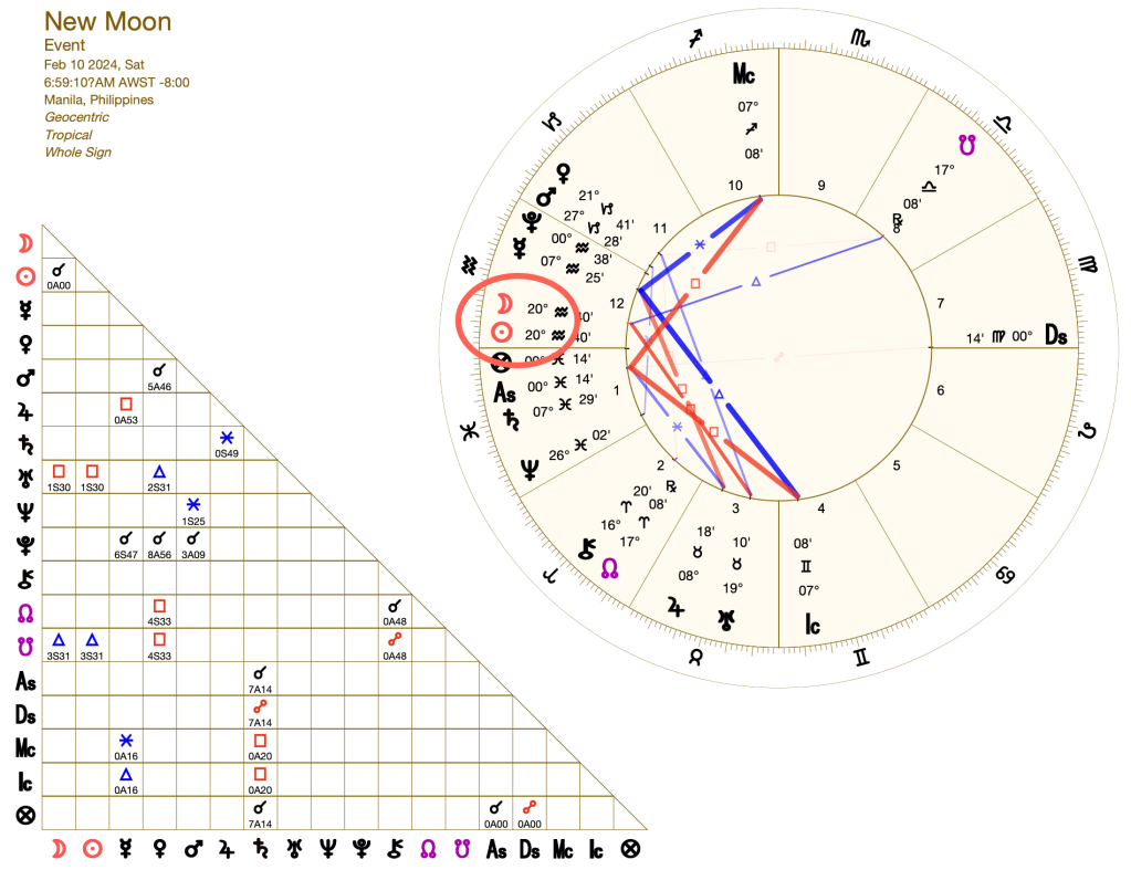 A New Moon happens on February 10, 2024 (6:59 AM, Philippine Time), at exactly 20°40 minutes in the realm of fixed air, AQUARIUS, the sign of the water bearer.