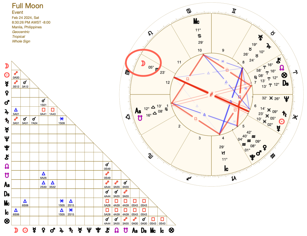 A FULL MOON happens on February 24, 2024 (8:30 PM, Philippine Time), at exactly 5°23′ minutes in the realm of mutable earth, VIRGO, the sign of service.