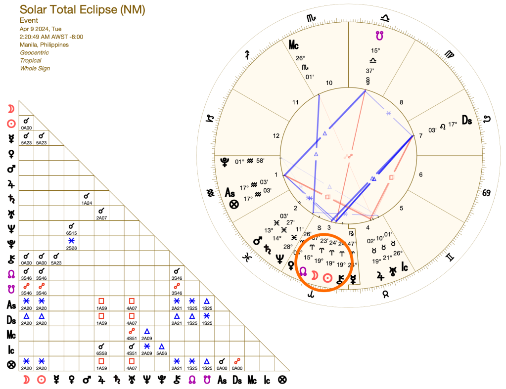 A New Moon TOTAL SOLAR ECLIPSE happens on APRIL 9, 2024 (2:20 AM, Philippine Time), at exactly 19°23 minutes in the realm of cardinal fire, ARIES, the sign of the warrior.
