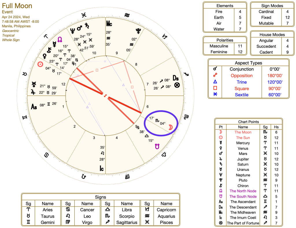 A FULL MOON happens on APRIL 24, 2024 (7:48 AM, Philippine Time), at exactly 5°23′ minutes in the realm of fixed water, SCORPIO, the sign of rebirth.