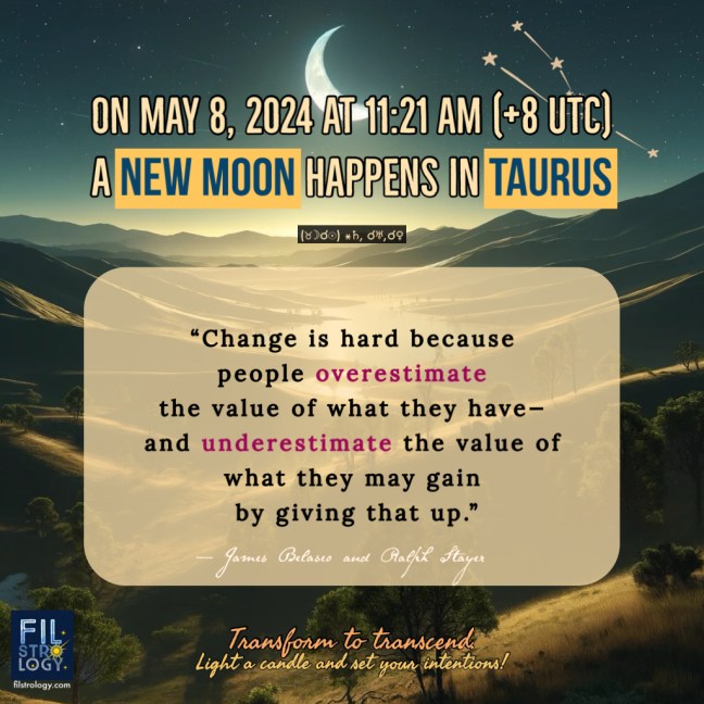 A New Moon happens on May 8, 2024 (11:21 AM, Philippine Time), at exactly 18°02 minutes in the realm of fixed earth, TAURUS, the sign of the Bull.