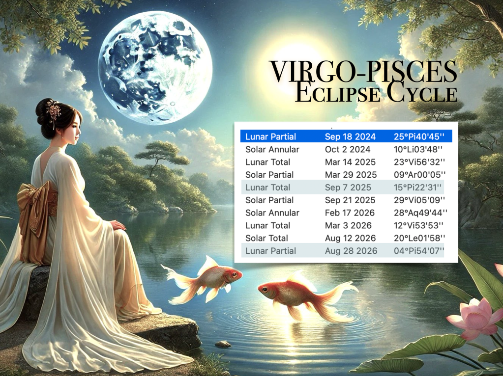 Eclipse season has arrived once more, dear reader, with a Full Moon Lunar Eclipse happening in the realm of mutable water: PISCES, the zodiac’s ocean of emotion! This lunation marks the beginning of a new eclipse cycle in the VIRGO-PISCES axis, with this particular cycle spanning roughly 2 years and 4 months, bringing significant beginnings and endings in the areas of your chart where these eclipses take place.