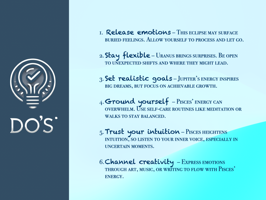 However, as we explore these creative visions, grounding is key. Jupiter may push us to dream big, and Uranus can bring exhilarating surprises, but we must remain rooted in the present, flexible, and realistic in our expectations! It’s not about clinging to specific outcomes or rigidly controlling the path ahead. Instead, trust the process, stay open to change, and allow yourself to flow with the energy of this eclipse. By blending imagination with practical steps, we can navigate these waves of emotion and opportunity, moving forward with clarity and confidence. And at the end of this, you might just find out that you are actually stronger, more resilient than you think!