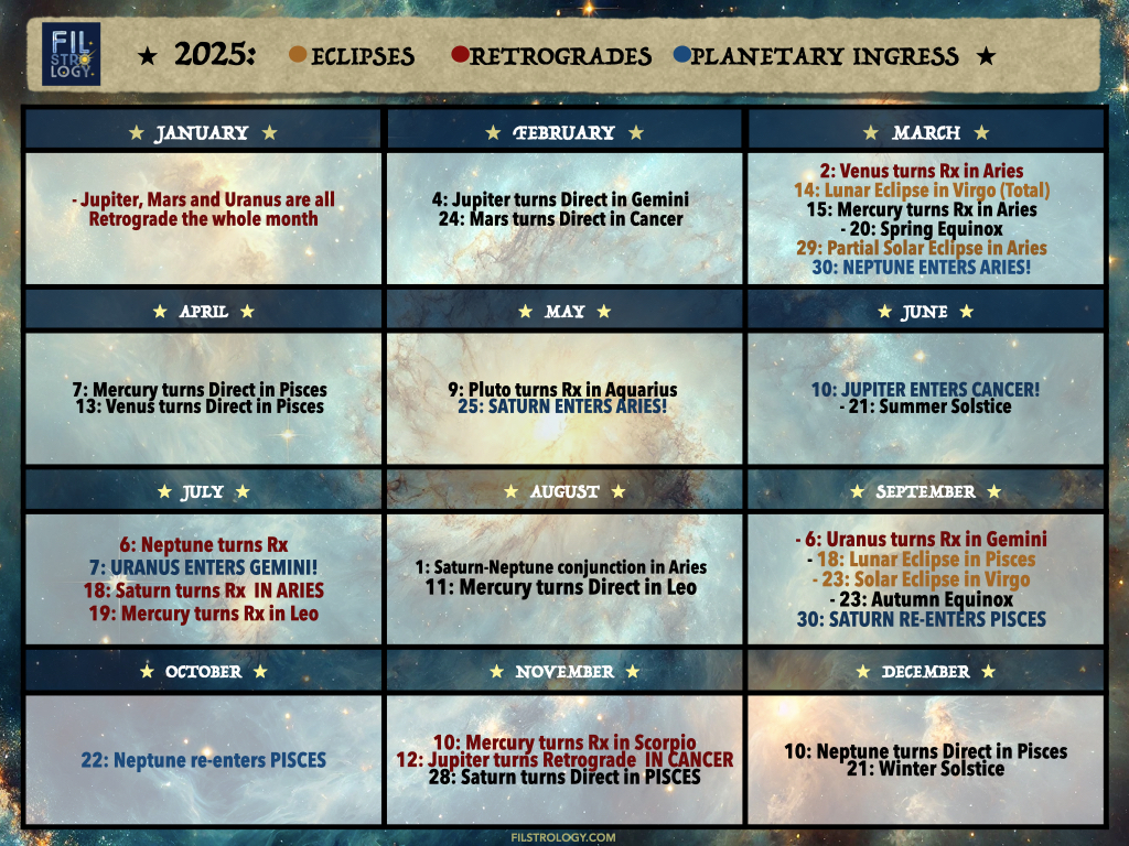 Of course, the year carries its usual retrogrades and eclipses, adding flavor to this already potent planetary ingresses. As always, we will discuss these in depth as the month go by. For now, here is an overview of the timelines: