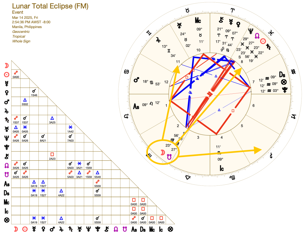 A Full Moon TOTAL LUNAR ECLIPSE happens on March 14, 2025 (2:45 PM, Philippine Time), at exactly 23°56′ of the realm of mutable earth: VIRGO, the sign of the maiden.