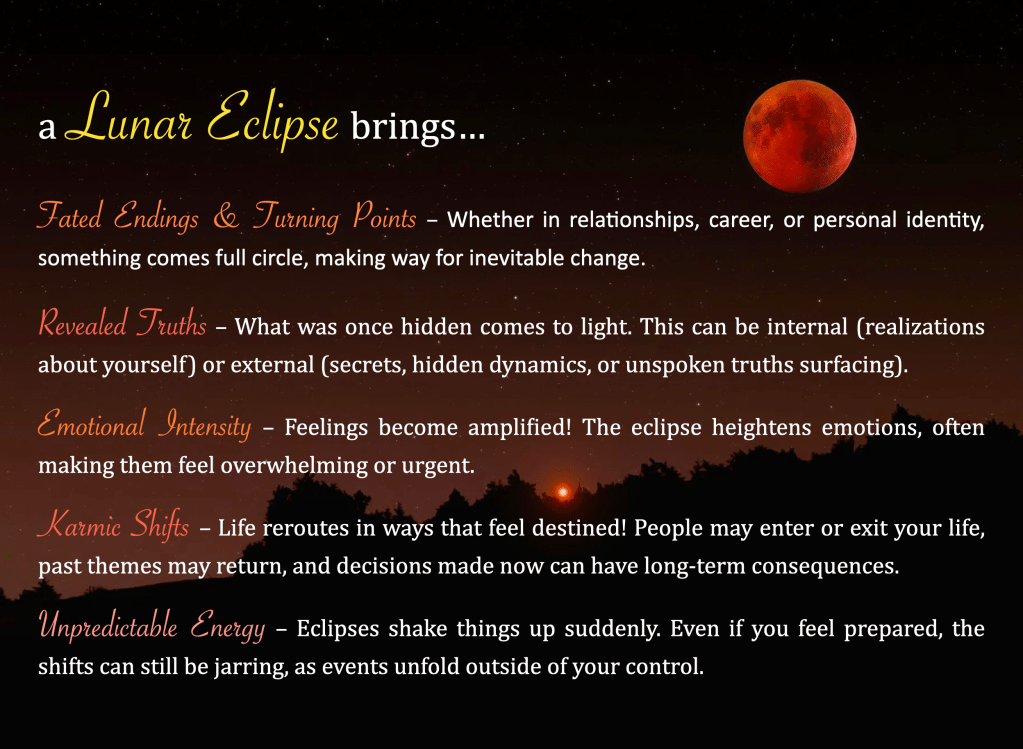Lunar eclipses often bring culminations, closures, and revelations, exposing what has been hidden and pushing us to release what no longer serves us. This eclipse signals a turning point, highlighting areas of life that need refinement or completion.