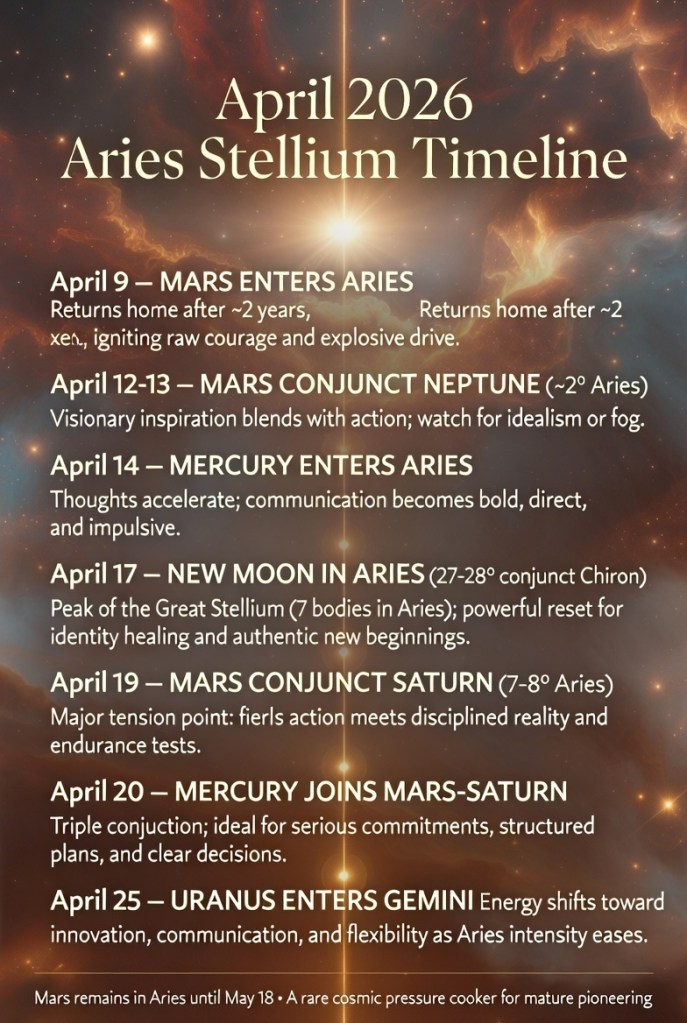This time, however, Mars doesn’t arrive into empty space. It charges straight into a crowded Aries stellium where slower-moving heavyweights Saturn (in Aries since mid-February) and Neptune are already stationed. Mercury joins on April 14, adding mental sharpness and urgency to the mix.