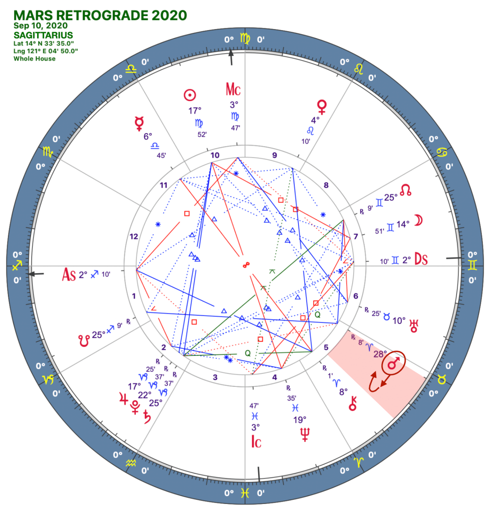 Mars turns retrograde specifically in your solar 5th House, back to your solar 4th House, covering the area highlighted below:
