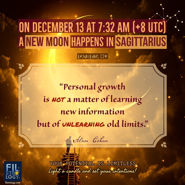 On December 1, 2024 (7:21 AM, Philippine Time), at exactly 9°32 minutes, a NEW MOON happens in the realm of Mutable Fire, SAGITTARIUS, the sign of the ARCHER. The New Moon signals the start of a new lunar phase, representing an opportunity for renewal and initiation. It’s a time for setting intentions, planting seeds for … Continue reading DECEMBER 1, 2024: NEW MOON in SAGITTARIUS